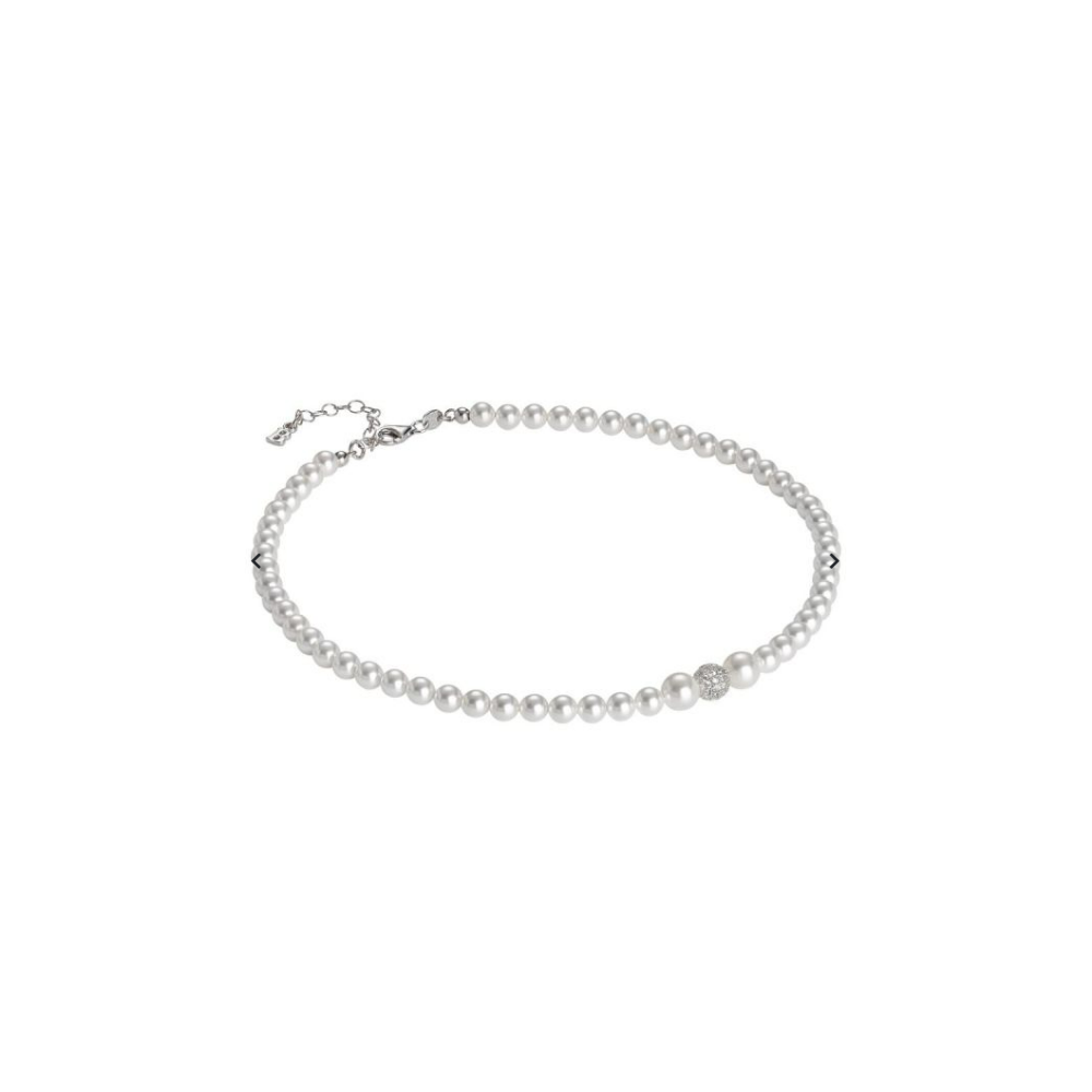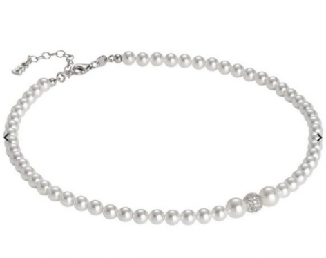 Collana in argento rodiato con filo di perle bianche degradè (diametro mm 6 e mm 8) con boule centrale in argento rodiato e zirconi. Lunghezza cm 39, estendibile fino a cm 46.