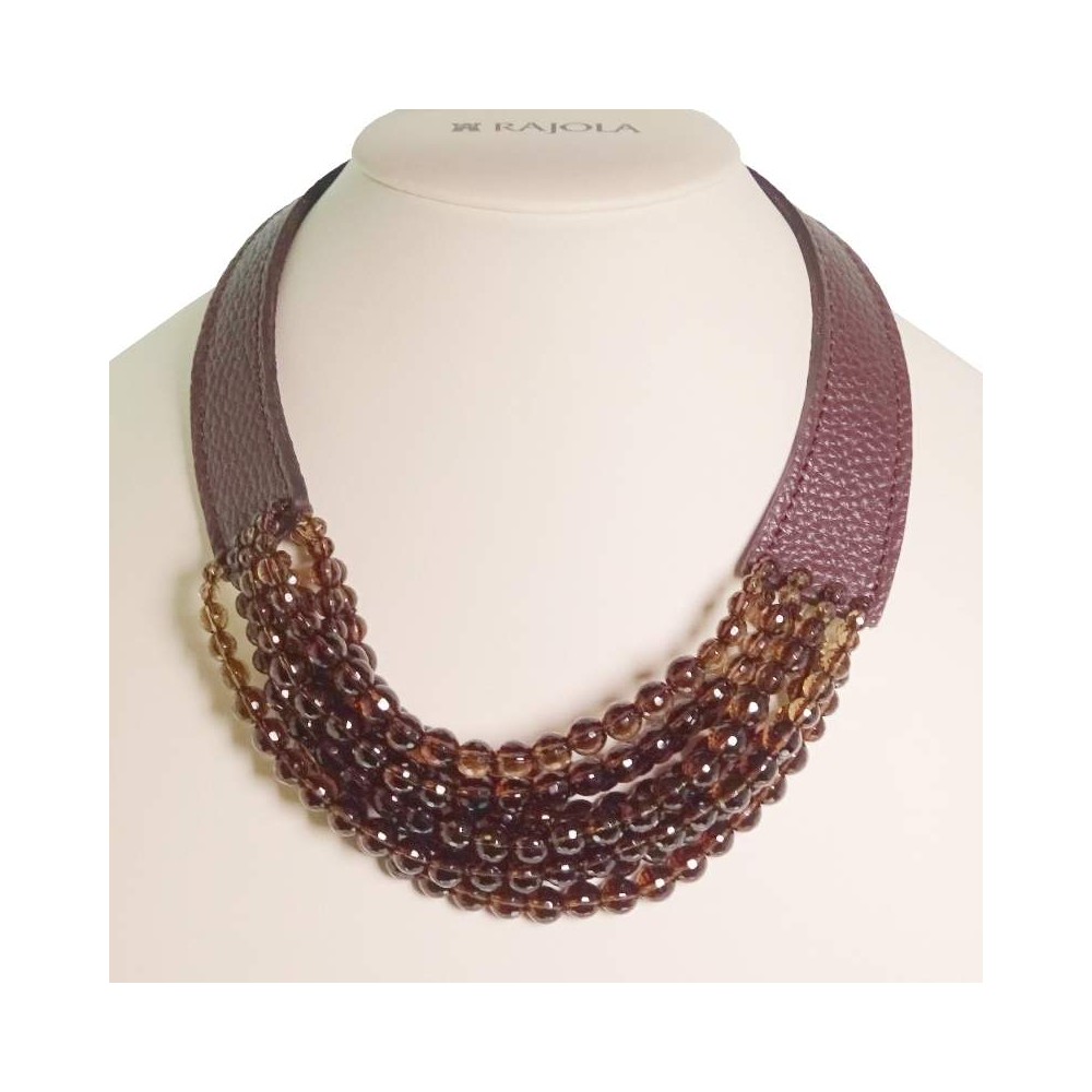Collana Multifilo Composta Da Quarzo Fume E Pelle. Placca Logo Rajola In Oro.