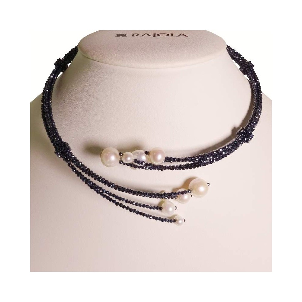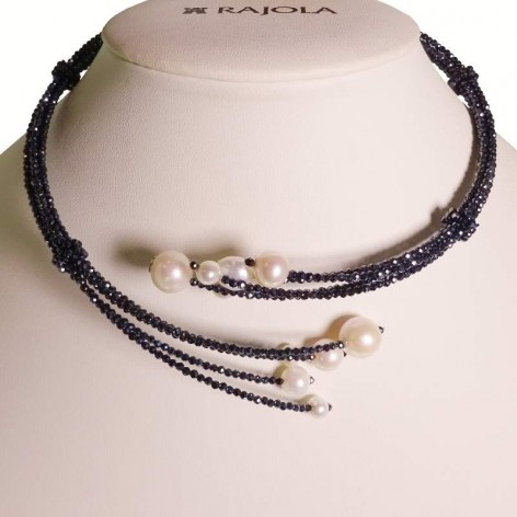 Collana CHOKER con Spinello Blu, Perle Bianche. Placca Logo Rajola In Oro.