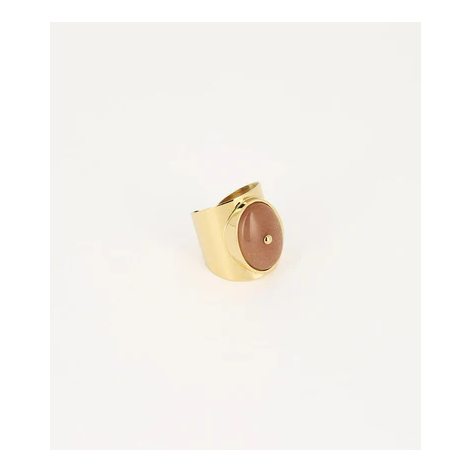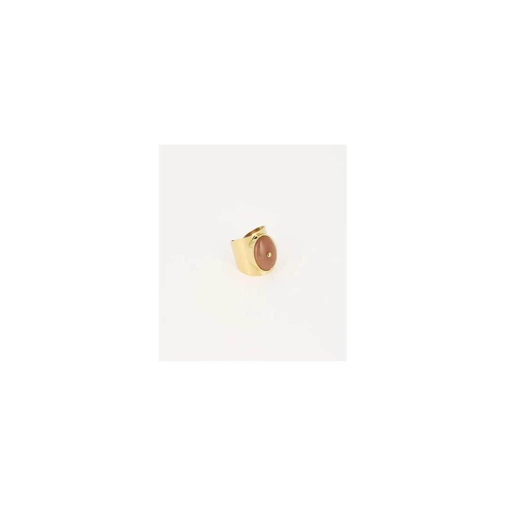 Ampio anello regolabile in acciaio semplice composto da una pietra naturale con una sfera in acciaio incastonata al centro.