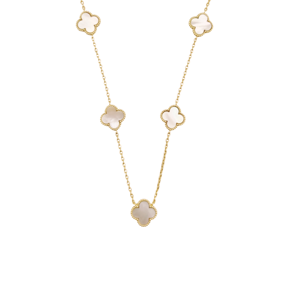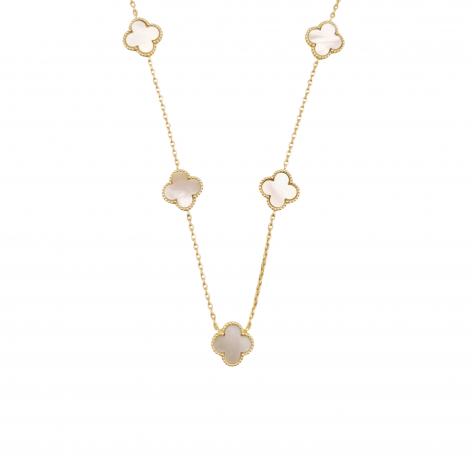 Collana In Argento 925% Dorato, Composta Da 5 Sagome A Fiore Con Madreperla. Chiusura A Moschettone.