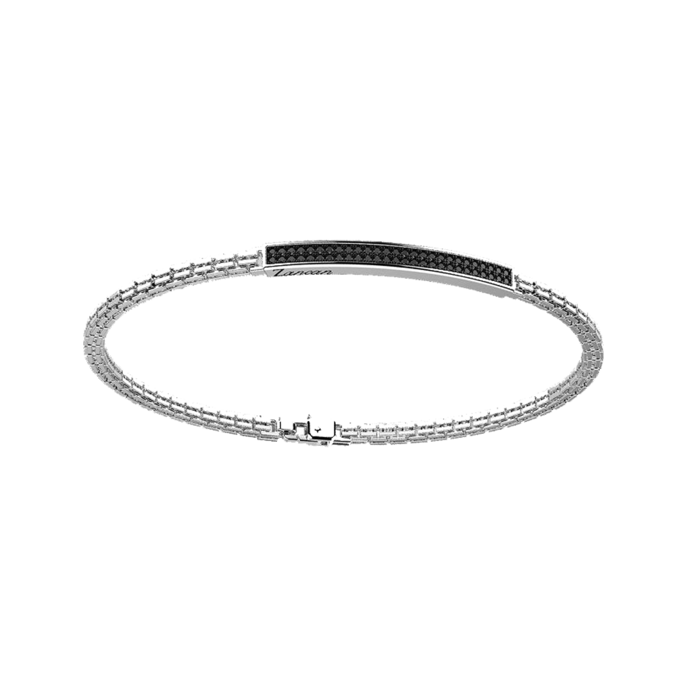 Bracciale In Argento 925% A Catena Con Targa E Doppia Fila Di Spinelli Neri Sulla Piastra Centrale.
