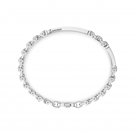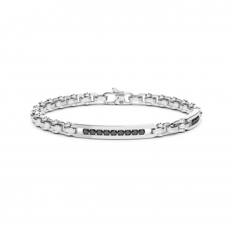 Bracciale A Maglia Morbida In Argneto 925%, Composto Da Maglie Rivettate E Da Due Targhe, Una Più Corta Con Incastonati Tre Spinelli Neri Ed L'Altra Più Lunga Con Nove Spinelli Neri.
