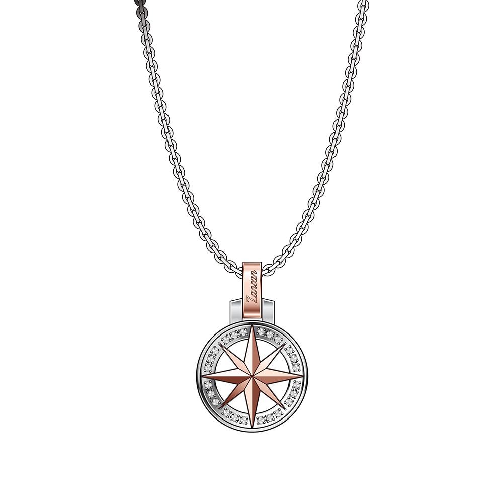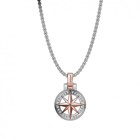 Collana In Acciaio 316L Ipoallergenico Con Zirconi, Maglia Rolò E Ciondolo Rotondo Con Rosa Dei Venti Rosè Contornata Da Zirconi.