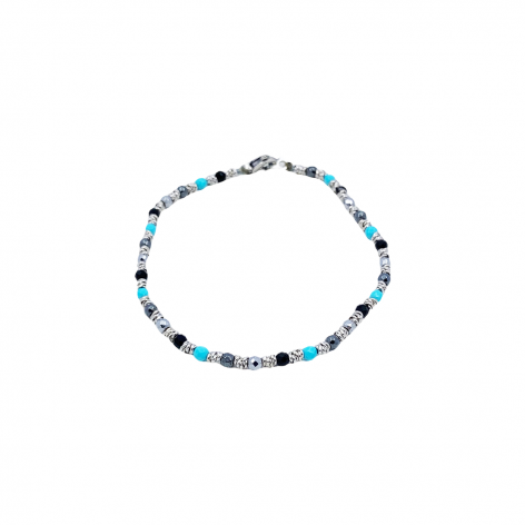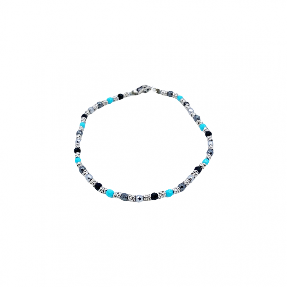 Bracciale In Metallo Realizzato Con Anellini In Argento 925% Ed Ematite Nera E Pietra Turchese.