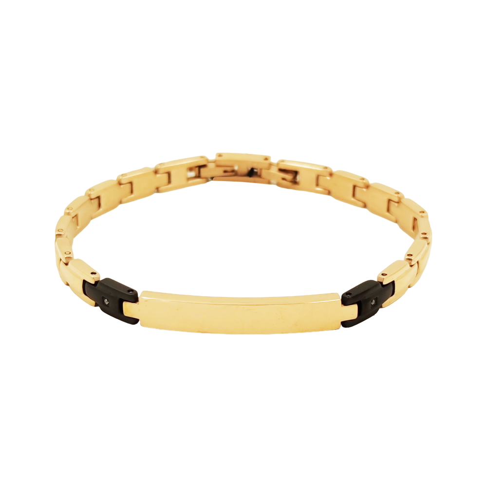 Braccialetto In Acciaio Rosé Composto Da Una Targhetta Centrale E Due Maglie Nero Opaco Con Zirconi Bianchi.