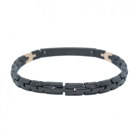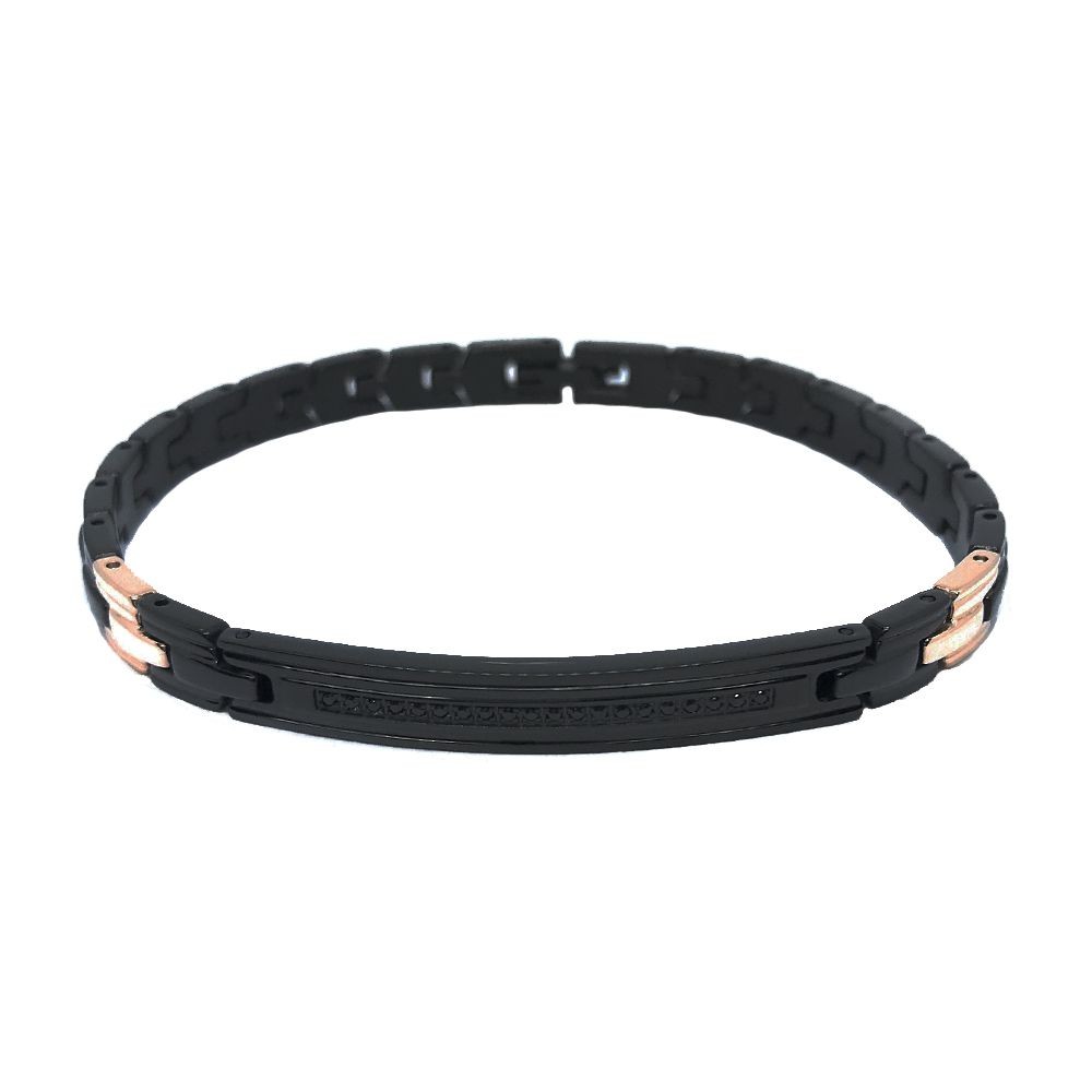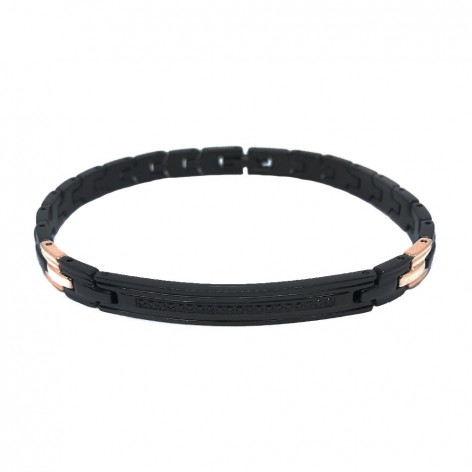Bracciale in Acciaio 316-L Ipoallergenico con PVD nero, spinelli e dettagli in PVD oro rosa, della collezione Hiteck, maglia stile coda di volpe larga con due maglie in PVD oro rosa, Targa centrale con PVD nero e una fila di spinelli neri.