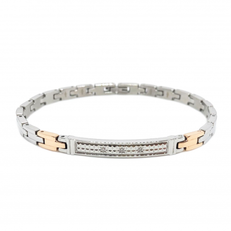 Bracciale in Acciaio, Fibbia Centrale Con Zirocni Bianchi E Due Maglie Rosé.