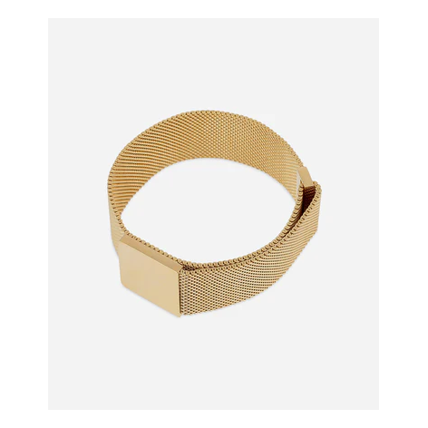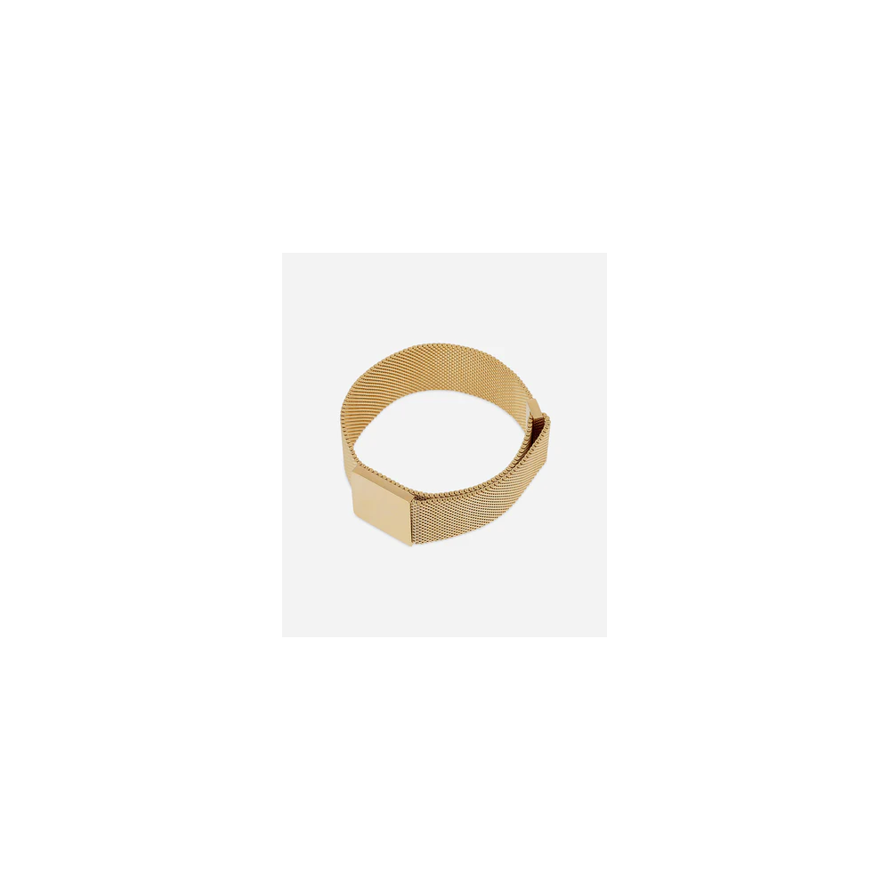 Ampio bracciale in acciaio placcato oro in "maglia milanese" con chiusura magnetica che si aggancia alla maglia del bracciale e si adatta alla misura del polso.