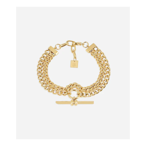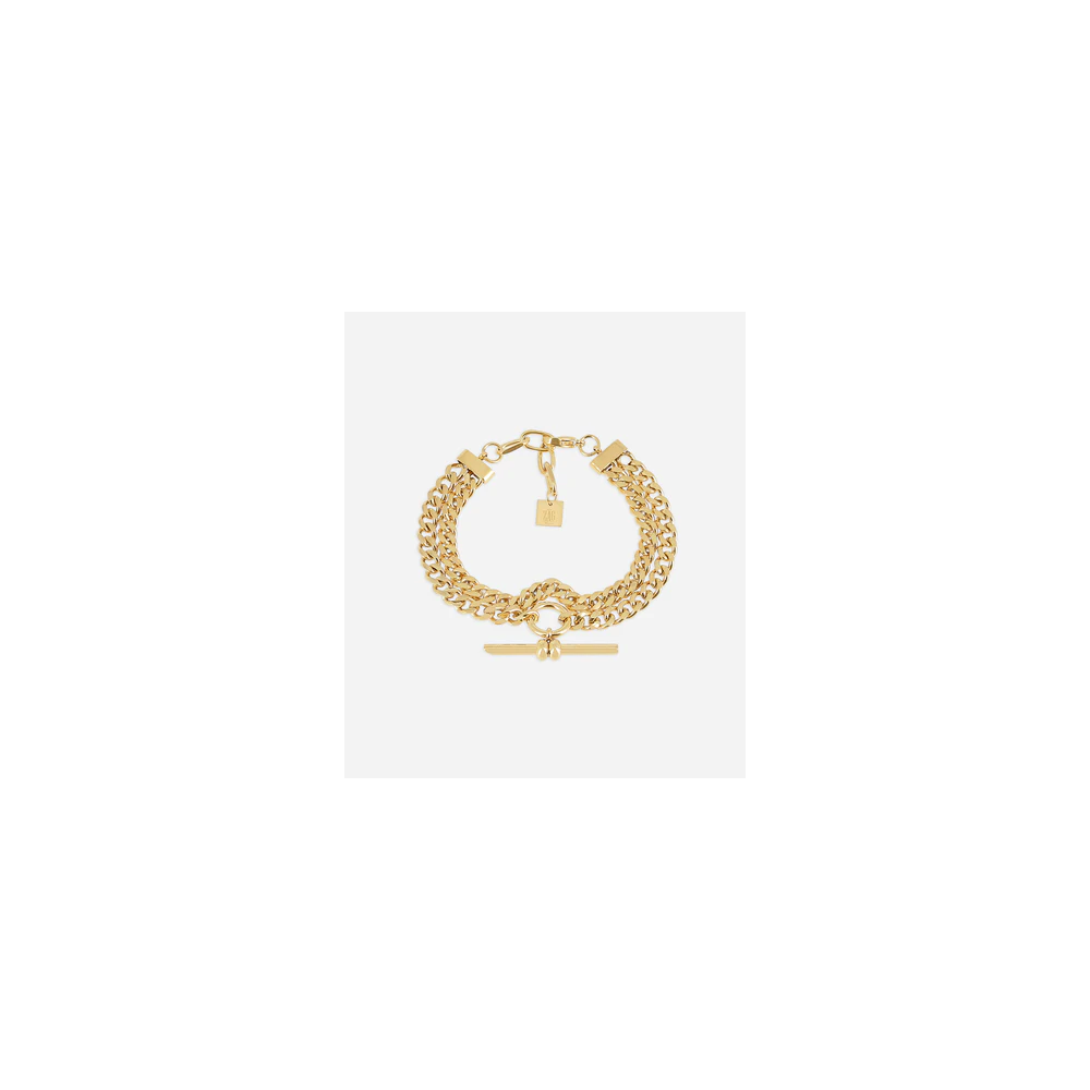Bracciale multifilo in acciaio placcato in oro fino. Al centro è incastonato un inserto rotondo con una barretta.