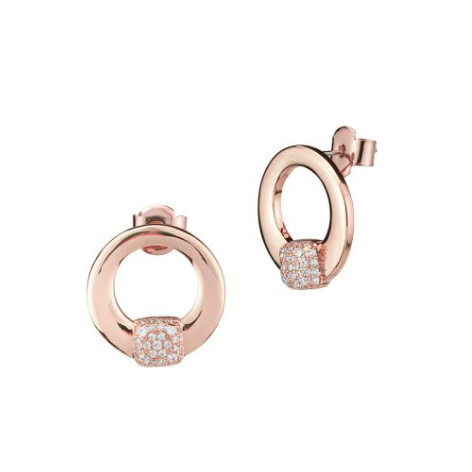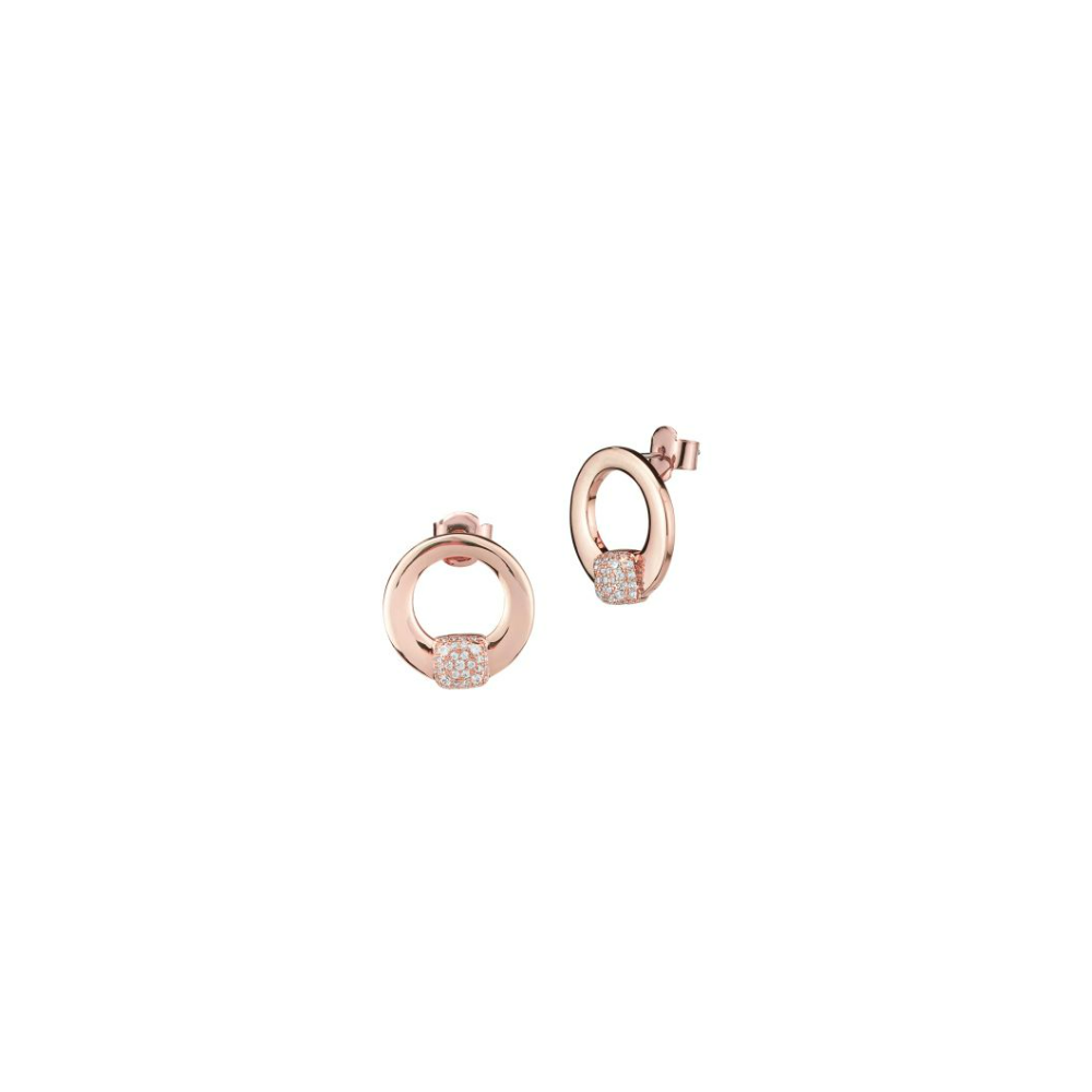 Orecchini placcati oro rosa con cerchi pendenti piccoli e quadrato centrale in pavè di zirconi.