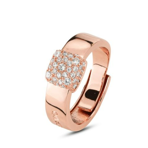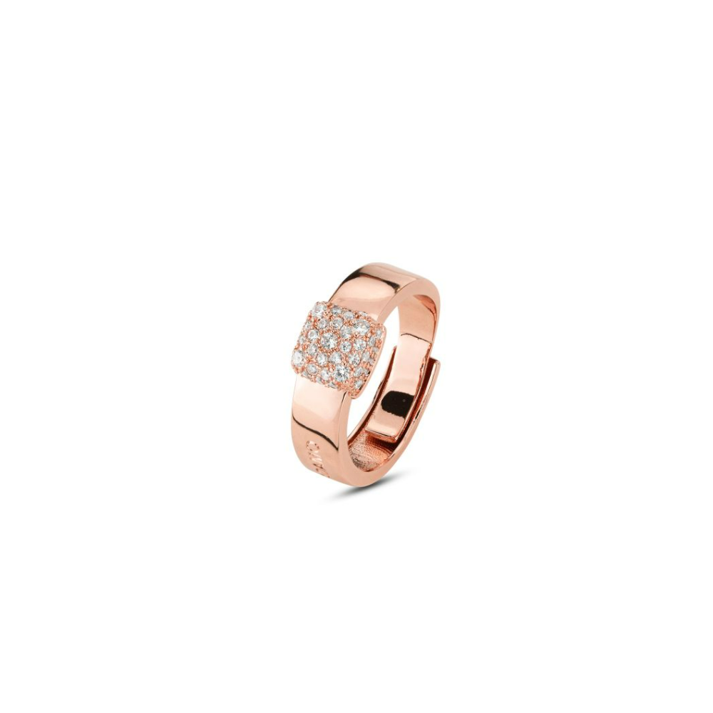 Anello placcato oro rosa a fascia larga regolabile con centrale quadrato in pavè di zirconi e brand Boccadamo laterale.