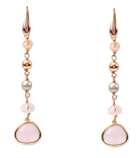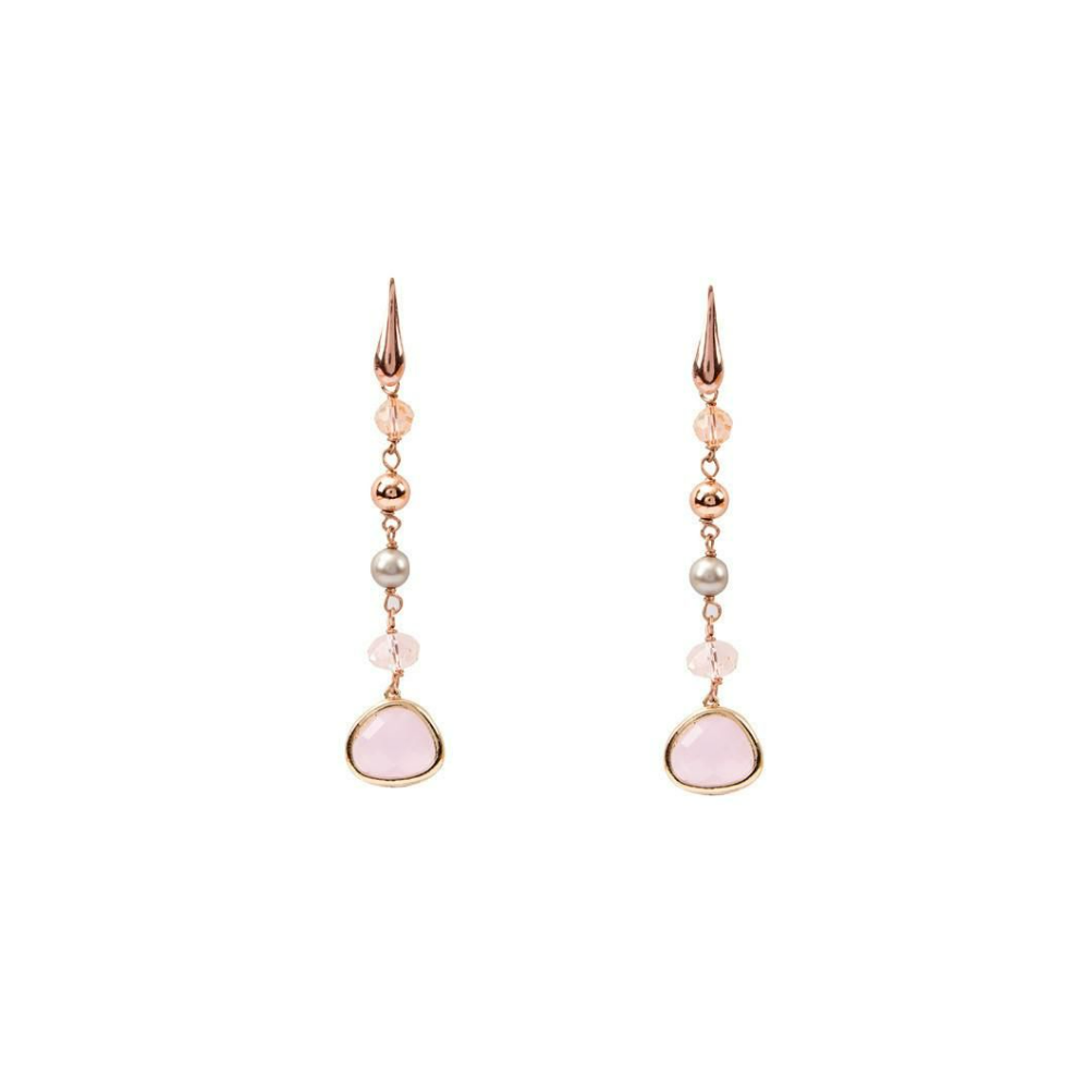 Orecchini pendenti in bronzo placcato oro rosa con cristalli briolette rosa opaco, perle Swarovski platinum e cristalli silk