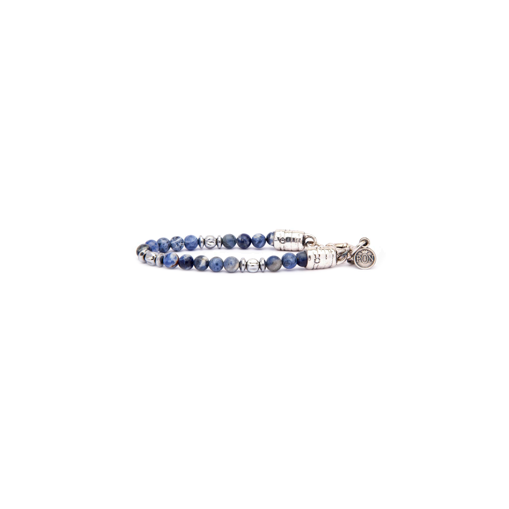 Bracciale con Sfere di Sodalite e Dettagli Placcato Argento Invecchiato con Sfere da 7 mm.Lunghezza regolabile da 18 cm a 21 cm.