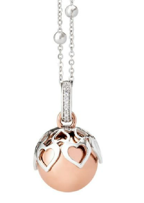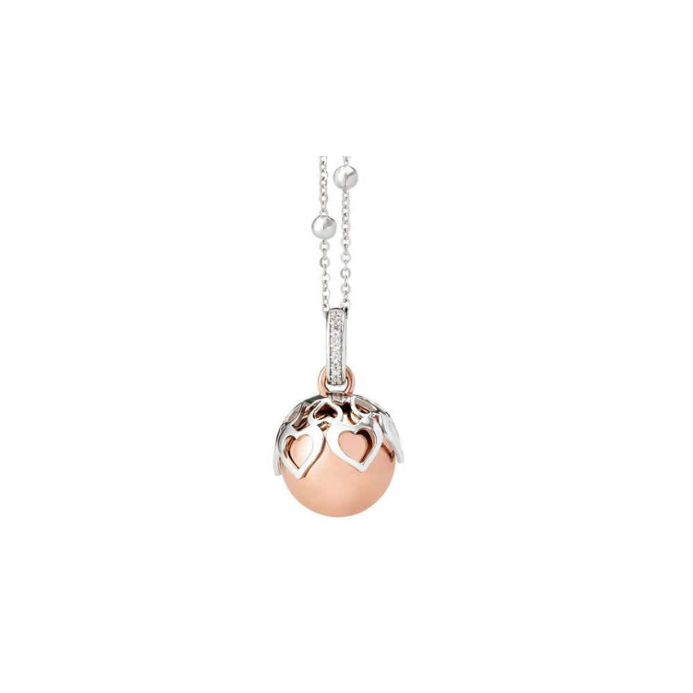 Collana in bronzo rodiato con contromaglia zirconata, ciondolo sonoro (diametro mm 14) e coppetta decorativa placcata e traforata. Duplice indosso: 1 filo - cm 100 / 2 fili - cm 50.