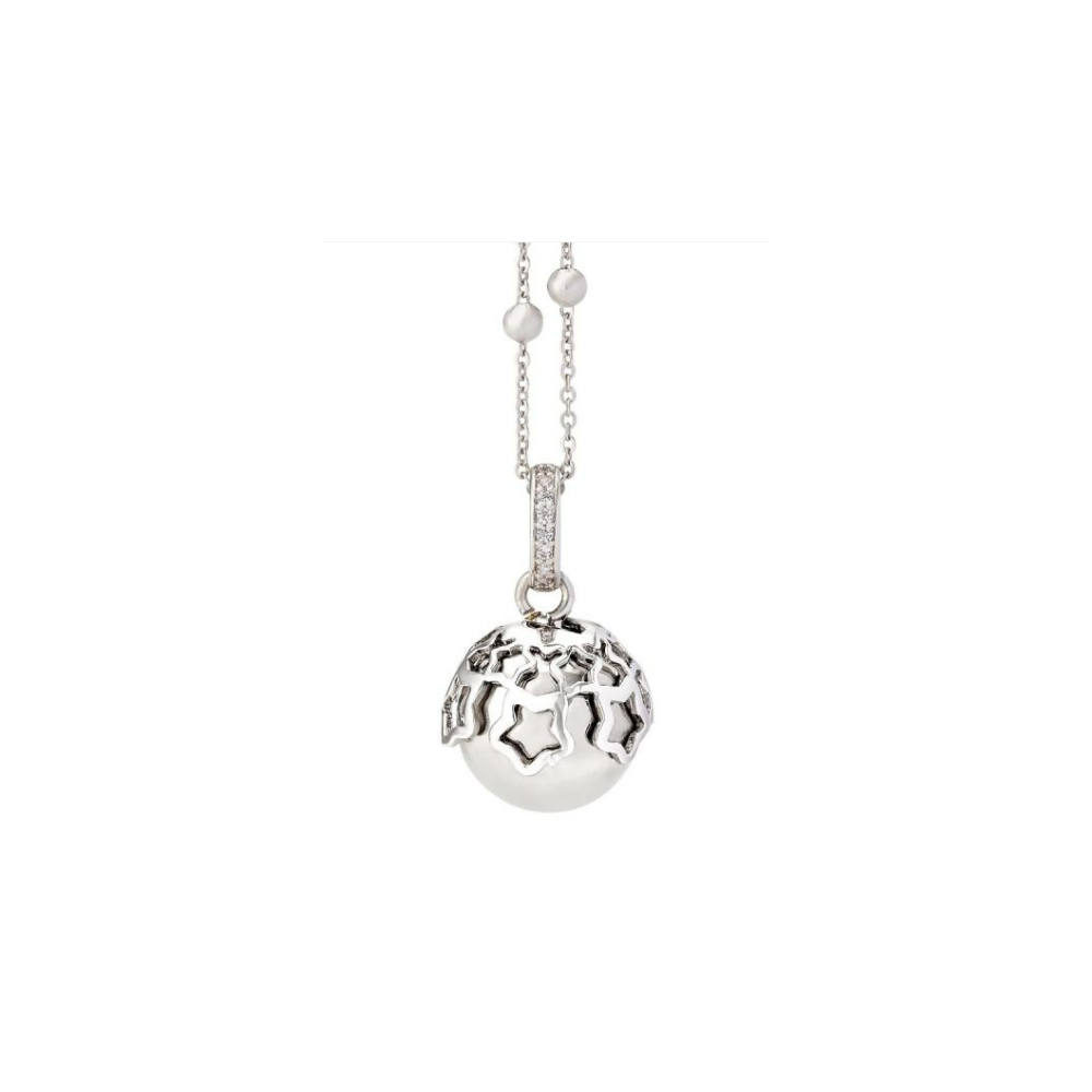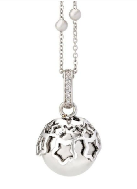 Collana in bronzo rodiato con contromaglia zirconata, ciondolo sonoro (diametro mm 14) e coppetta decorativa placcata e traforata. Duplice indosso: 1 filo - cm 100 / 2 fili - cm 50.
