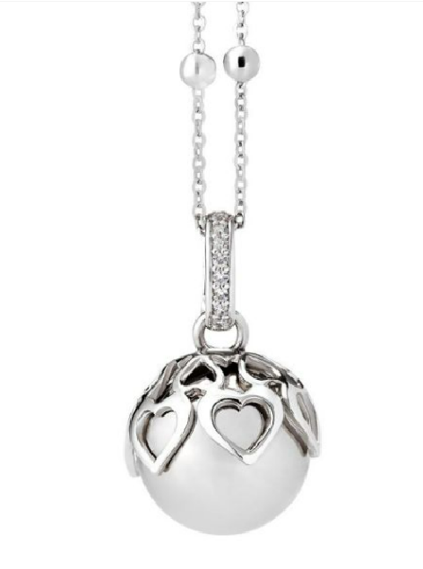 Collana in bronzo rodiato con contromaglia zirconata, ciondolo sonoro (diametro mm 14) e coppetta decorativa placcata e traforata. Duplice indosso: 1 filo - cm 100 / 2 fili - cm 50.