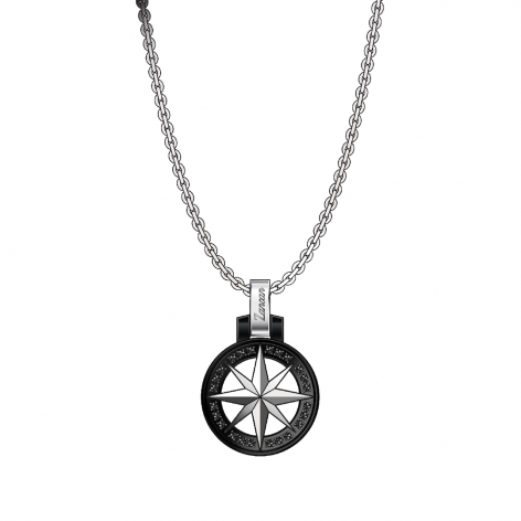 Collana In Acciaio Inossidabile 316L Composto Da Catena E A Ciondolo Tondo Nero Con Rosa Dei Venti Impreziosito Dda Spinelli Neri. Misura Standard 50 cm.