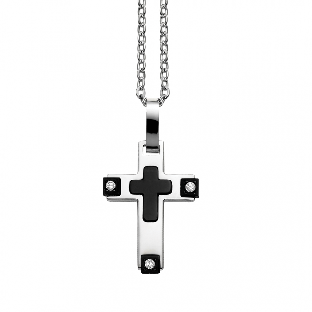 Collana In Acciaio 316L, Composta Da Croce Pendente Con Inserti Neri E Pietre.