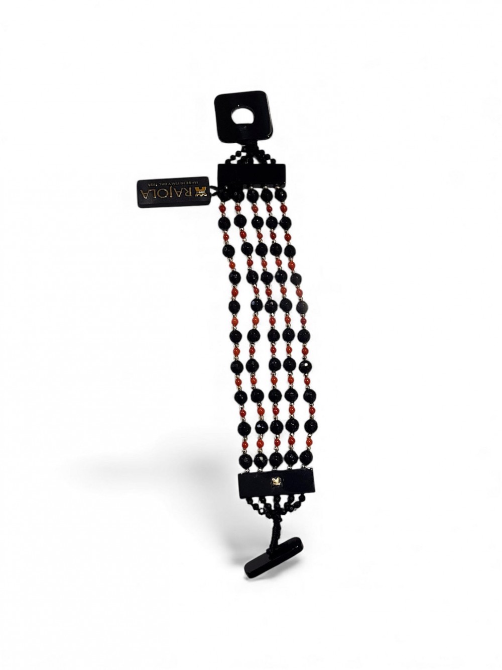 Bracciale Multifilo Composto Da Pietre Naturali, Onice Corallo Rosso Ematite . Placca Logo Rajola In Oro.