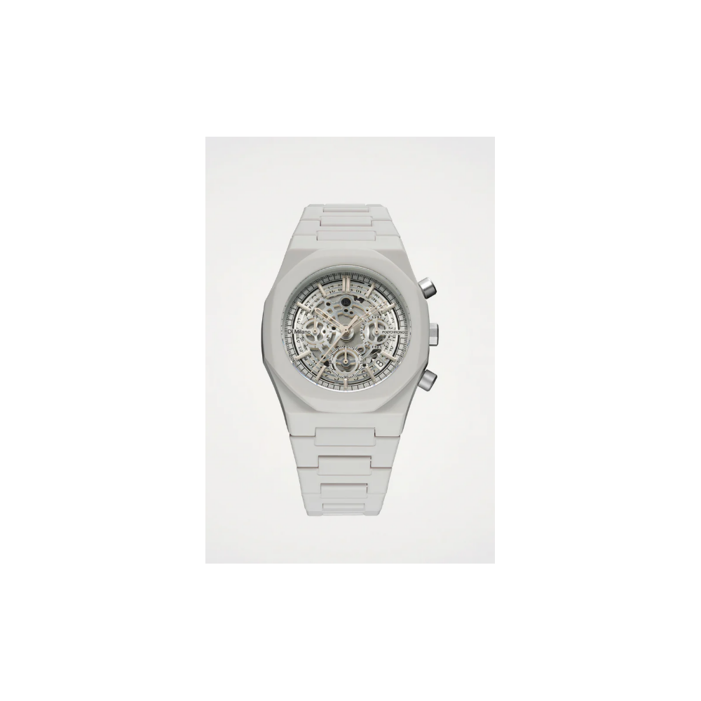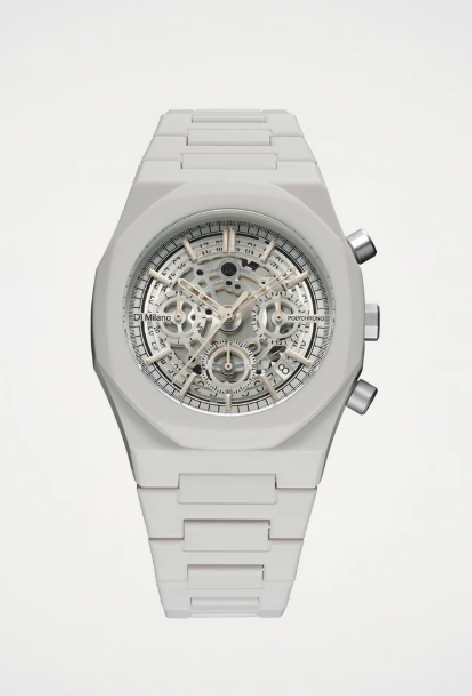 La palette grigio chiaro monocromatica è arricchita da un quadrante scheletrato tono su tono che lascia intravedere il movimento, donando profondità e carattere tecnico. I dettagli tono su tono grigio sulle lancette dei sotto-quadranti cronografici aggiungono un tocco grafico deciso, per un look che non passa inosservato.
