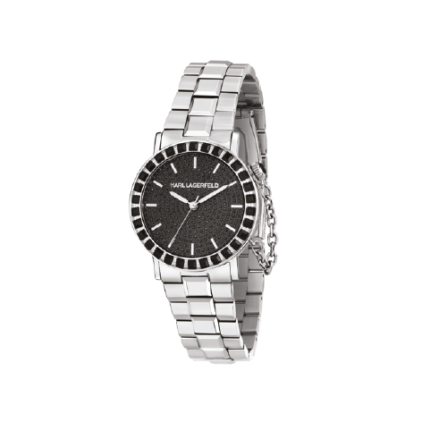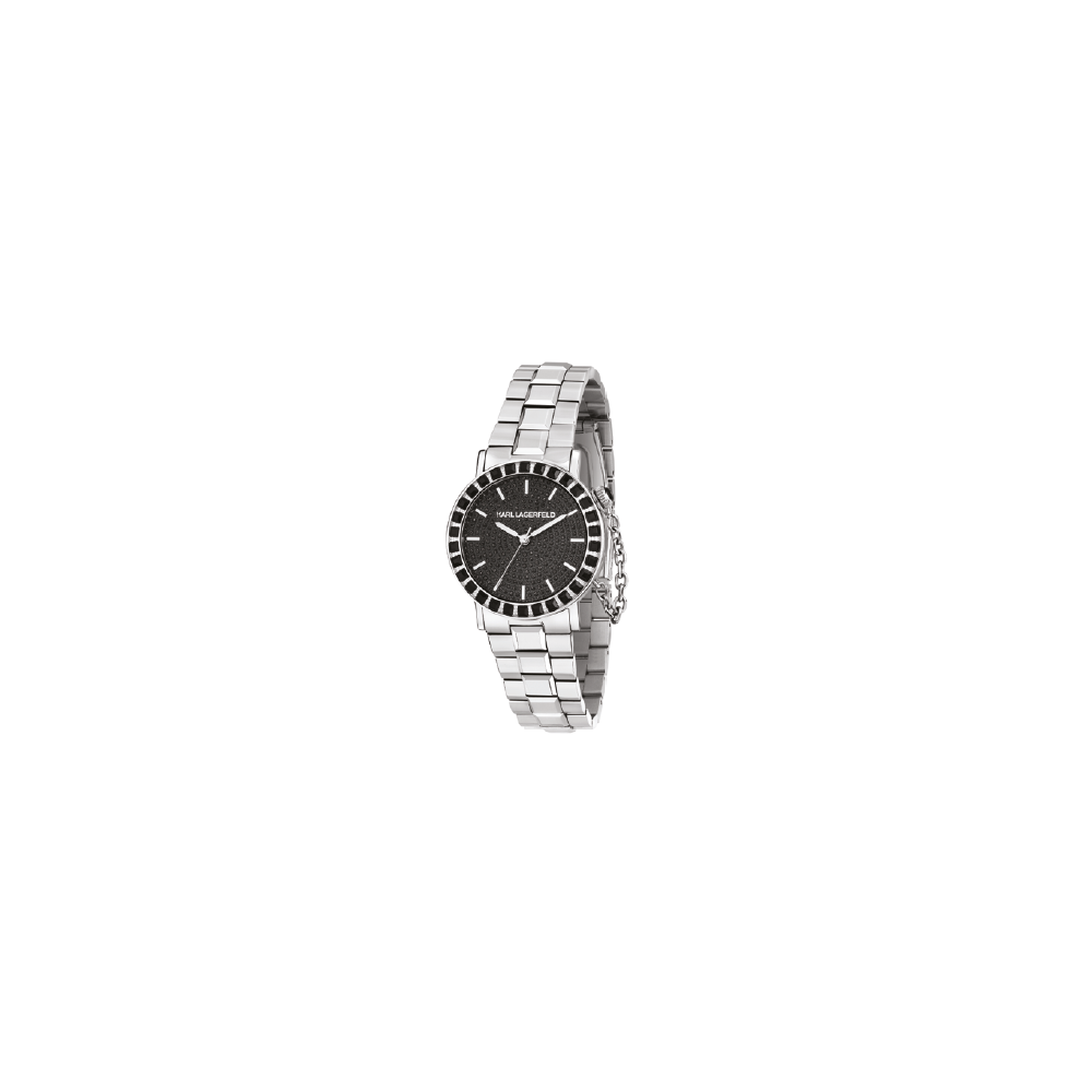 Orologio donna Karl Lagerfeld in finitura Argento: cassa tonda, quadrante fondo nero con indici a cristallo e logo a ore 12. Bracciale in metallo a maglie con chiusura deployante.