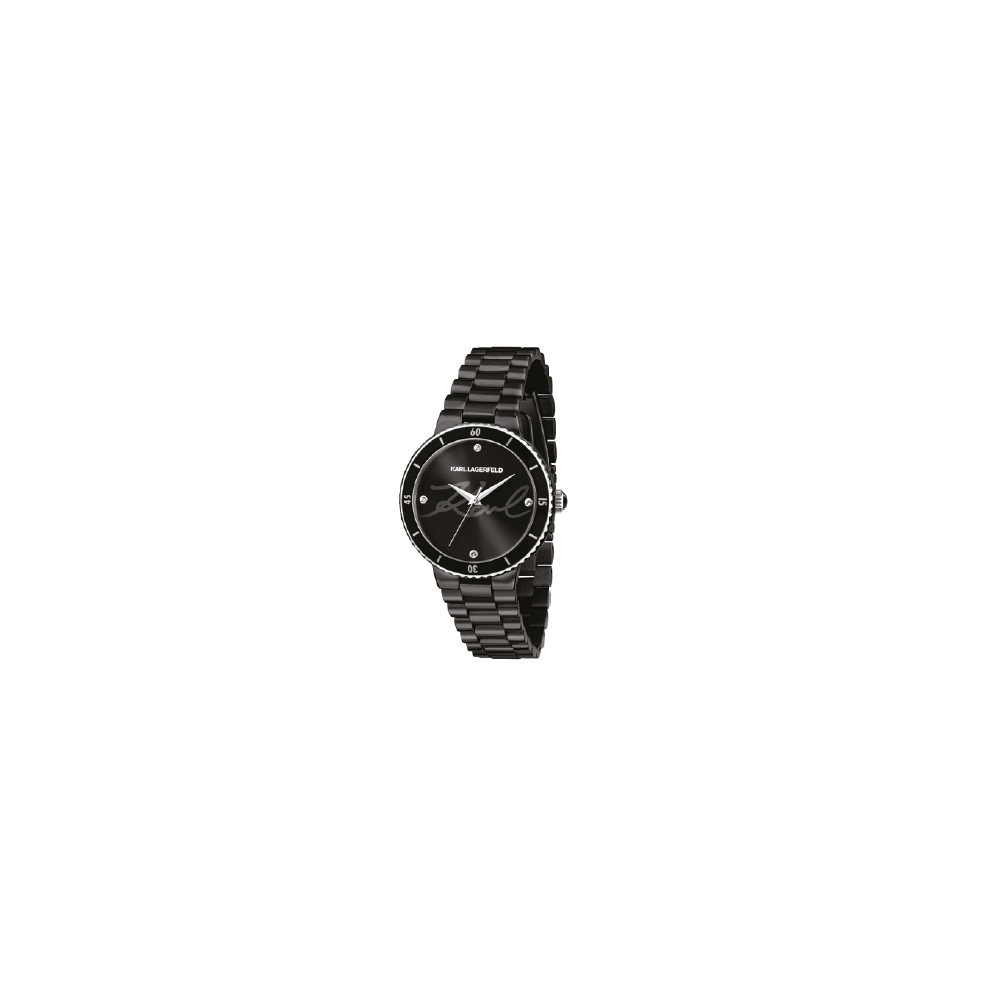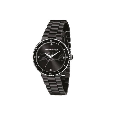 Orologio donna Karl Lagerfeld in finitura brunita : cassa tonda, quadrante fondo nero con indici a cristallo e logo a ore 12. Bracciale in metallo a maglie con chiusura deployante.