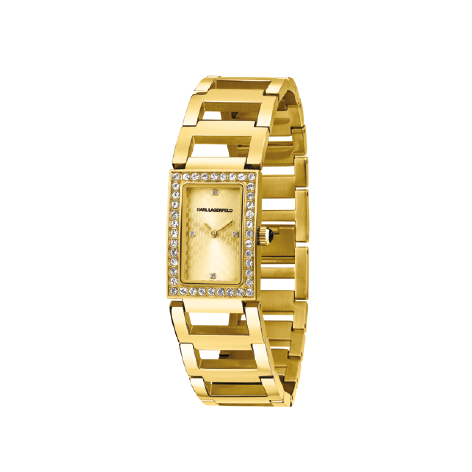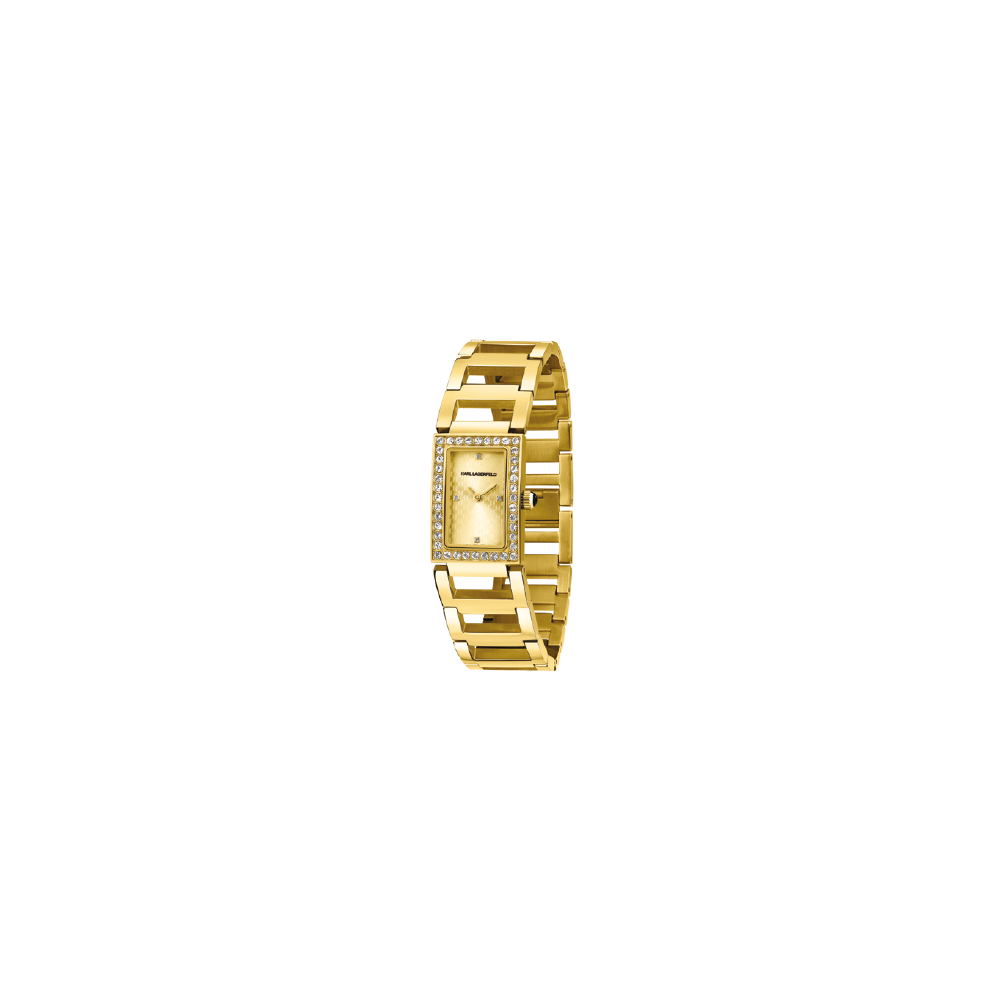 Orologio donna Karl Lagerfeld in finitura Oro : cassa Rettangolare, quadrante fondo tono su tono con indici a cristallo e logo a ore 12. Bracciale in metallo a maglie È una chiusura gioiello (box clasp) integrata a scomparsa .