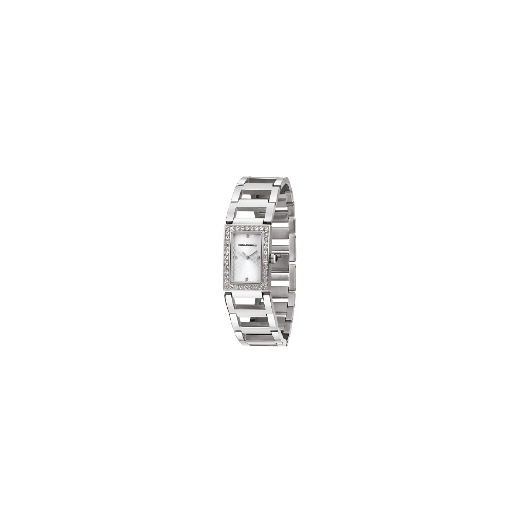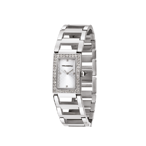 Orologio donna Karl Lagerfeld in finitura Argento : cassa Rettangolare, quadrante fondo tono su tono con indici a cristallo e logo a ore 12. Bracciale in metallo a maglie È una chiusura gioiello (box clasp) integrata a scomparsa .