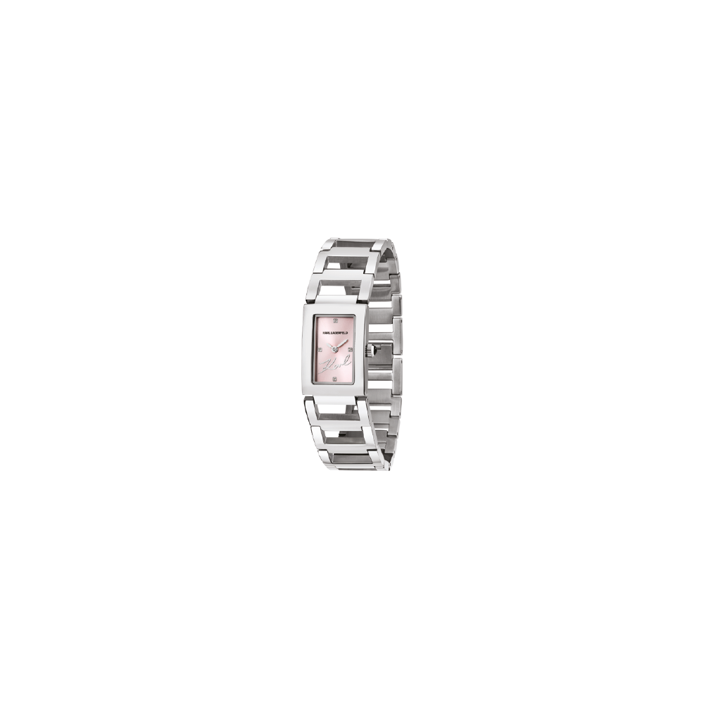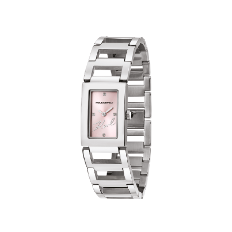 Orologio donna Karl Lagerfeld in finitura Argento : cassa Rettangolare, quadrante fondo Rosa con indici a cristallo e logo a ore 12. Bracciale in metallo a maglie È una chiusura gioiello (box clasp) integrata a scomparsa .