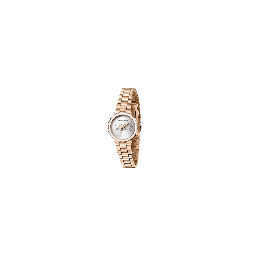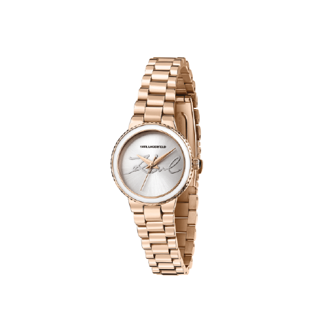 Orologio donna Karl Lagerfeld in finitura Rosè : cassa tonda con ghiera bianca, quadrante fondo argento e logo a ore 12. Bracciale in metallo a maglie con chiusura deployante.