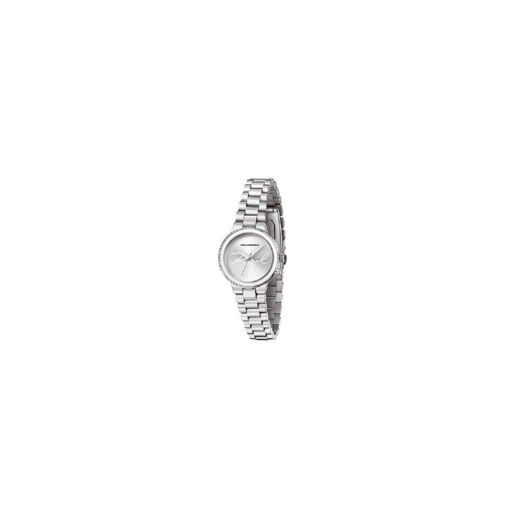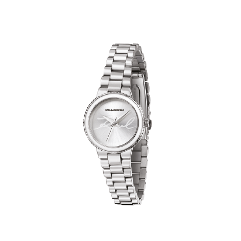 Orologio donna Karl Lagerfeld in finitura Argento : cassa tonda con ghiera bianca, quadrante fondo argento e logo a ore 12. Bracciale in metallo a maglie con chiusura deployante.