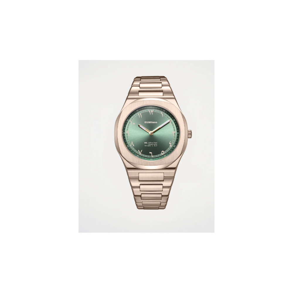Cassa in acciaio inossidabile da 39 mm e quadrante in ottone verde oliva inciso con numeri arabi. Protetto da vetro zaffiro antiriflesso, il bracciale in acciaio segue la geometria naturale del polso per un design confortevole e discreto.