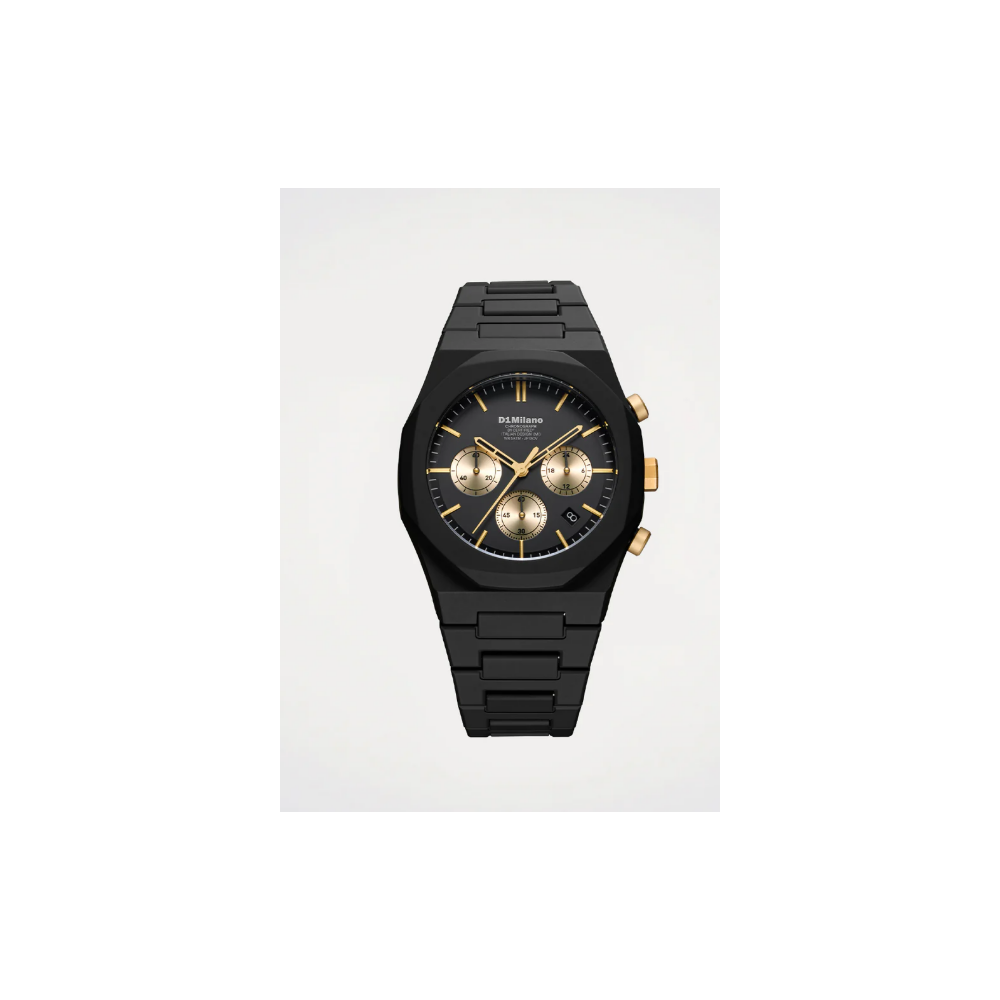 Realizzato in policarbonato morbido al tatto, questo orologio con cassa da 40,5 mm presenta un quadrante in ottone nero e vetro minerale antiriflesso. Il design presenta dettagli cronografici in metallo dorato e una finitura nera opaca, con cinturino integrato sagomato per una vestibilità sicura e precisa.