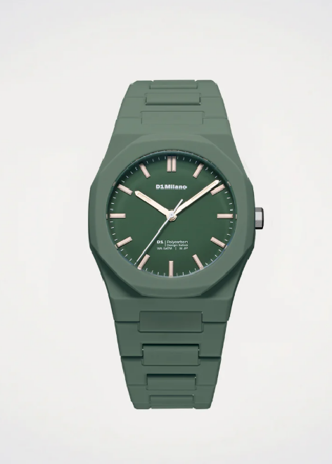 Realizzato in policarbonato leggero, questo orologio con cassa da 40,5 mm presenta un quadrante in ottone verde e vetro minerale antiriflesso. Il cinturino ergonomico segue la forma naturale del polso, garantendo una vestibilità stabile e un'estetica pulita e monocromatica.