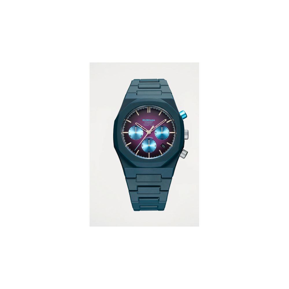 Questo modello da 40,5 mm presenta una cassa in policarbonato e un quadrante in ottone blu. Protetto da un vetro minerale antiriflesso, il cinturino curvo integrato garantisce una vestibilità comoda, mantenendo una silhouette moderna che abbraccia i cronografi.